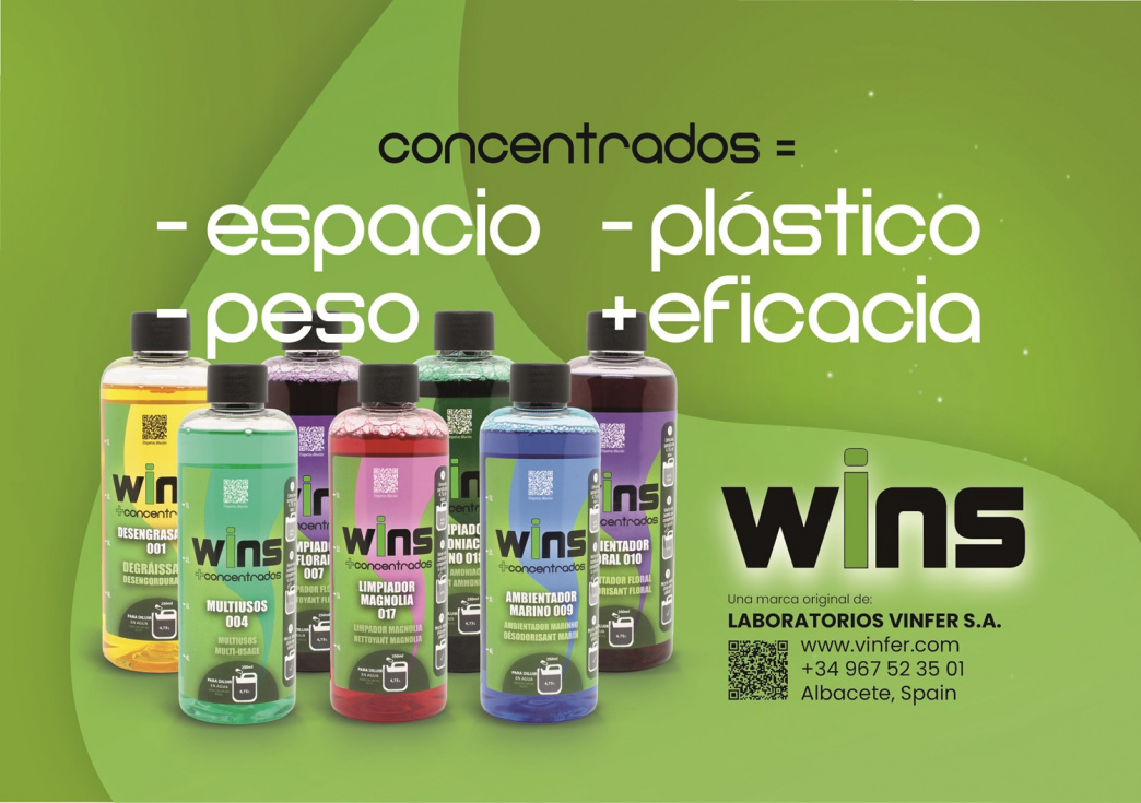 Wins concentrados es la solución de limpieza diseñada para ofrecer máxima eficacia ocupando el mínimo espacio. Gracias a su fórmula, se ha conseguido reducir plástico, peso y volumen.